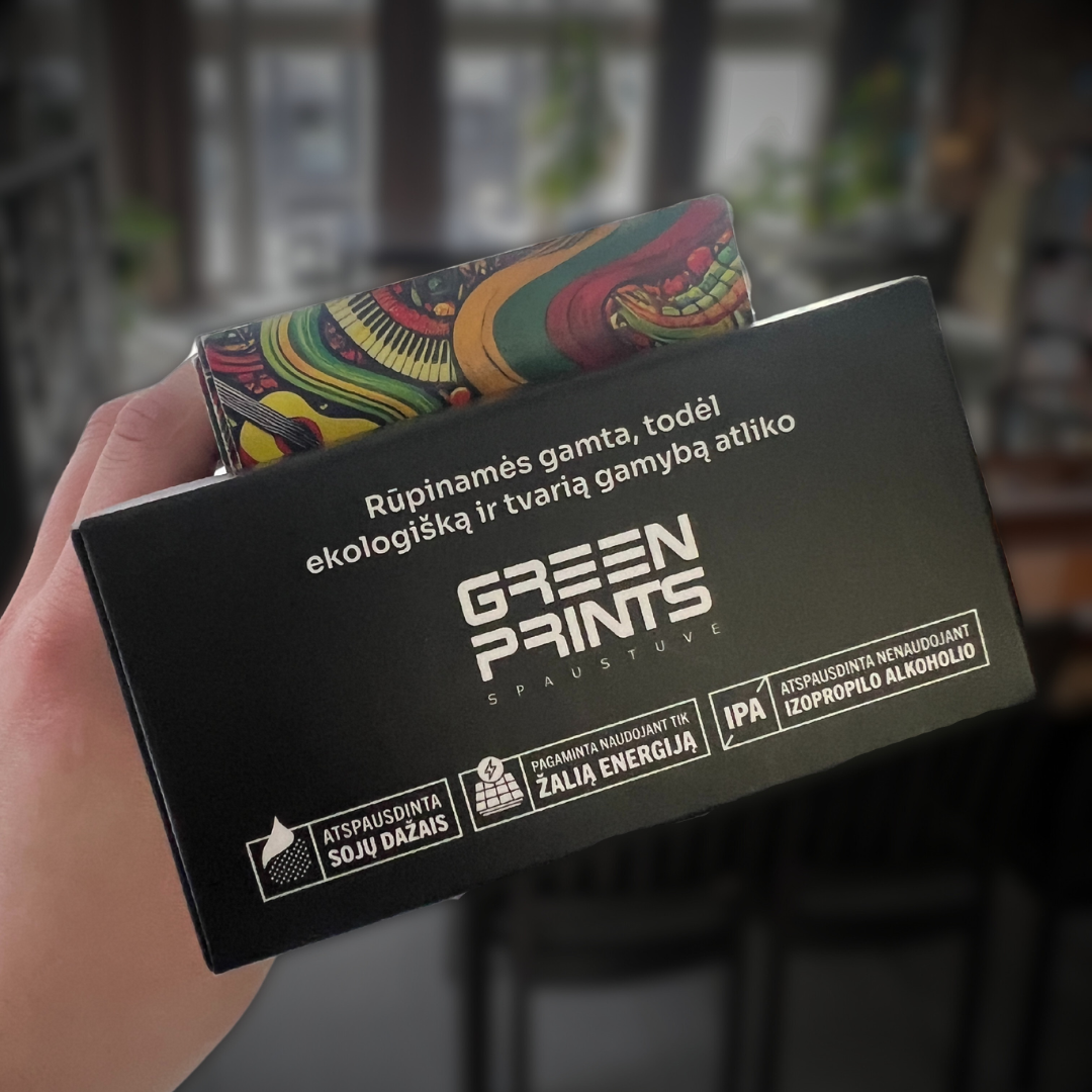 Žaidimas pagamintas Lietuvoje, naudojant ekologiškas medžiagas (sojos dažus, tvarią energiją ir t.t.) ir nenaudojant plastiko.